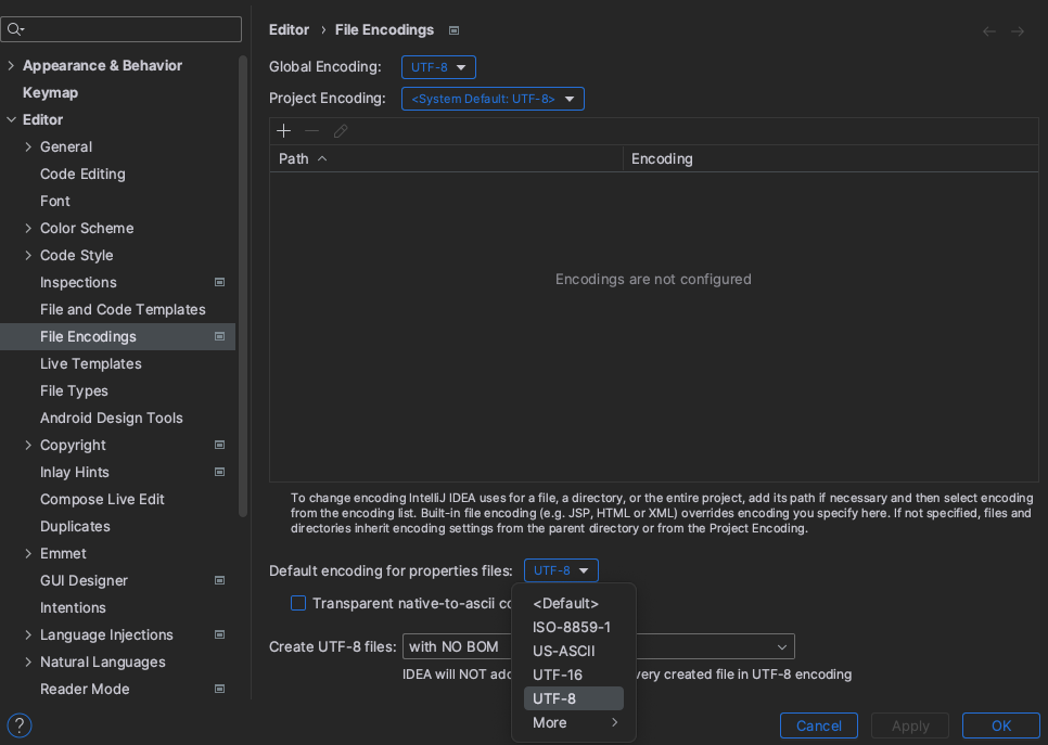 - Default encoding for properties files의 인코딩 설정을 UTF-8로 변경한다.