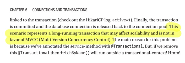 Spring Boot Persistence Best Practice 요약하면 Transaction이 너무 긴 Long Transaction이고 동시적인 요청을 받고 있을때 성능적으로 단점이 있기 때문이다.