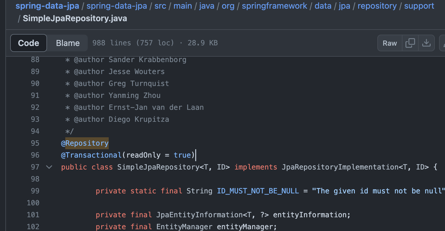 Spring-Data-JPA 프로젝트를 뜯어보면 @Repository에 @Transactional을 선언해서 제작한 것을 알수 있다.
