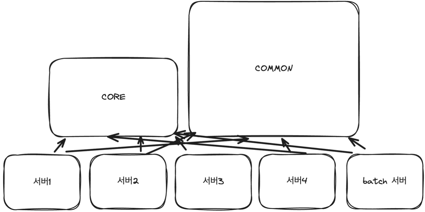 - common이나 core 변경하면 서버 5대 전부 재빌드 (빌드 속도가 느렸다.)