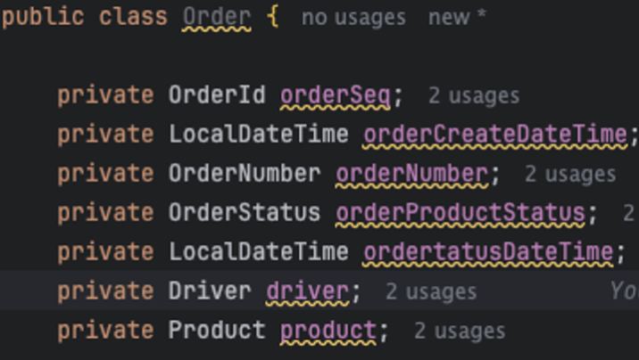 { "orderSeq": 1, "orderCreatDateTime": "2024-04-24 20:32:53", "orderNumber": "0000", "orderProductState": "미사용", "expiredDate": 2024-05-25 "driver": { "name": "김철수", "tel": "010-0000-0000", "userLoginId": "hello", }, "product": { "productCode": "9808908", "productName": "오브젝트", "price": 30000, "productState": "판매중" } }- String으로 퉁치지 말고 아래처럼 VO 객체를 정의해서 사용한다.