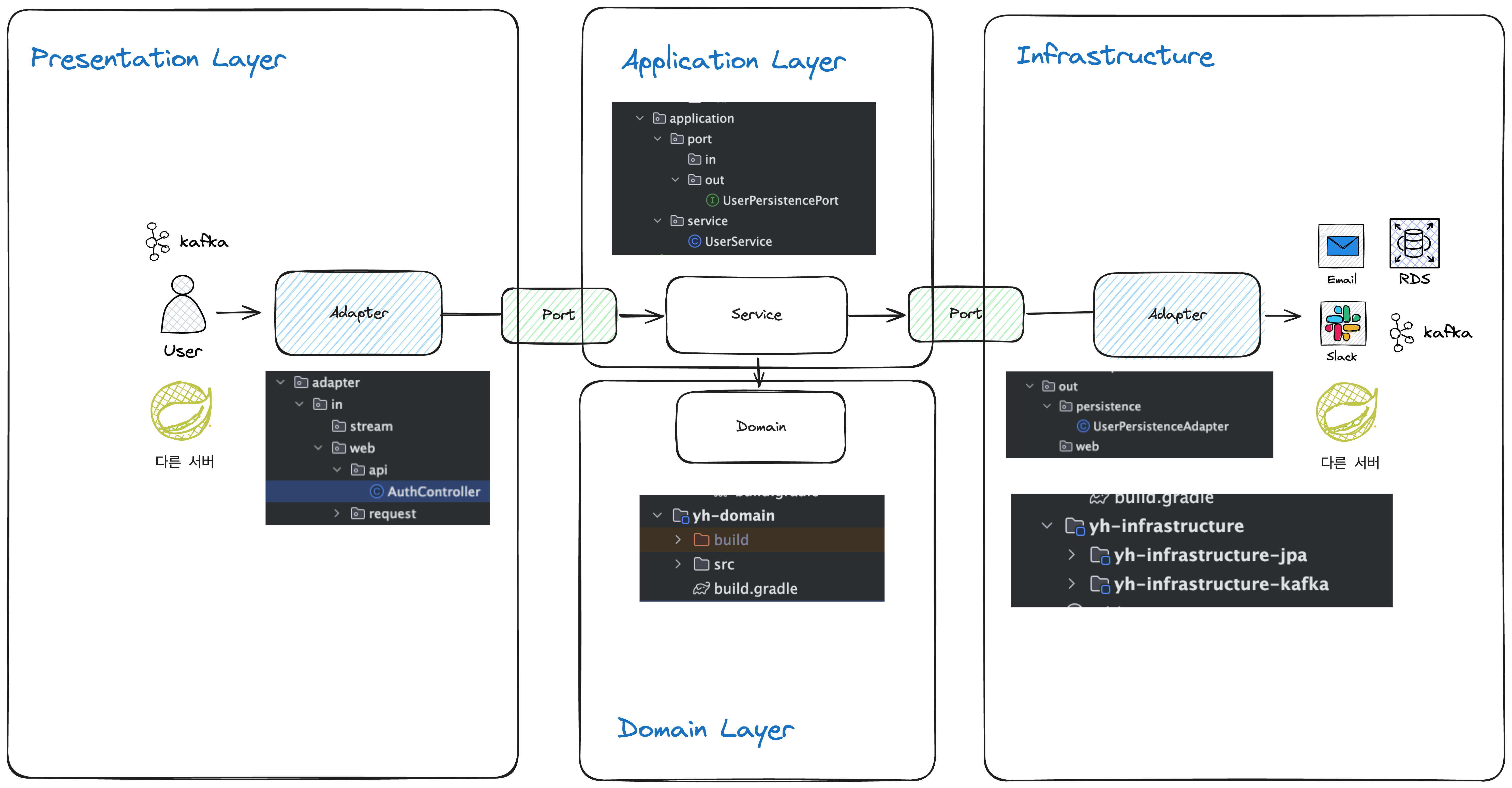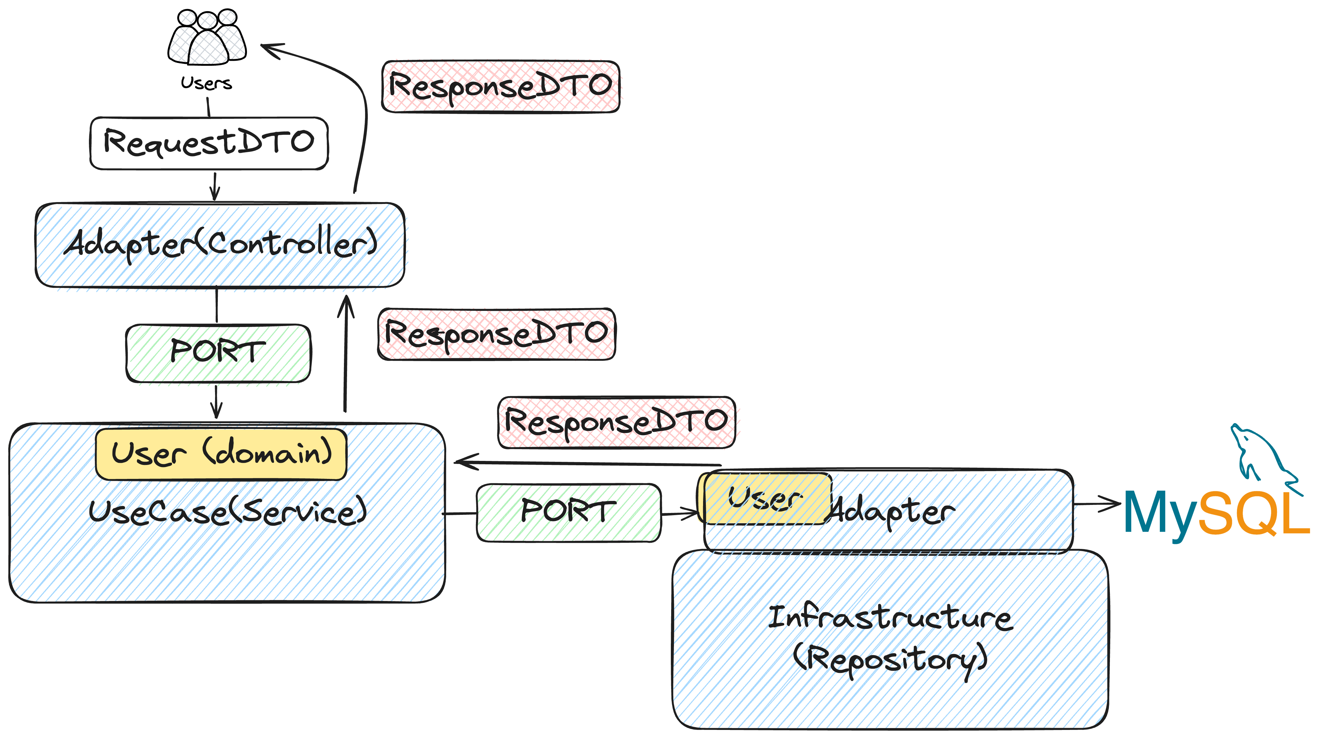 - 테스트가 쉬워진다. (레이어드 아키텍처에서는 사실상 Data Access Layer는 Mock 하지 않으면 테스트가 불가능한데, port adapter 패턴을 사용하면 Mock을 사용하지 않고 테스트 가능하다.)