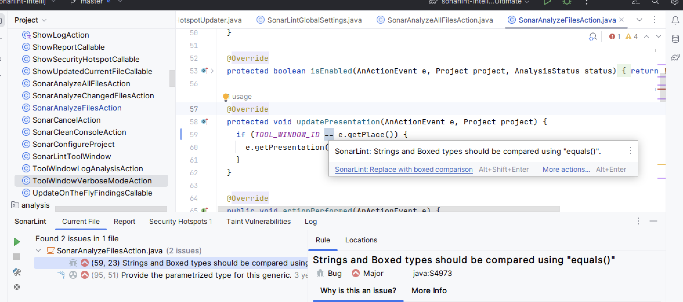 - 밑에 예시를 보면 == 보다 equals를 써라 같이 코딩할때 alert로 알려준다.