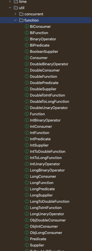- 엄청 많은데 큰 분류로, Function, Functional Interface, Consumer, Supplier, Predicate, Comparator의 사용법을 알면 원시타입용도 인터페이스(박싱 안해서 메모리 덜 사용), 추가 매개변수용도 인터페이스와 같이 구분할 수 있다.