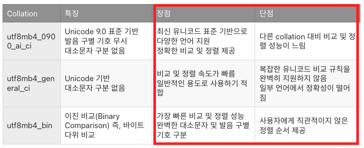- utf8mb4_0900_ai_ci 은 한국이나 동아시아 국가 언어에서 정렬, 검색 이슈가 있다. (예를 들면 가 = ㄱㅏ 동일하게 취급)