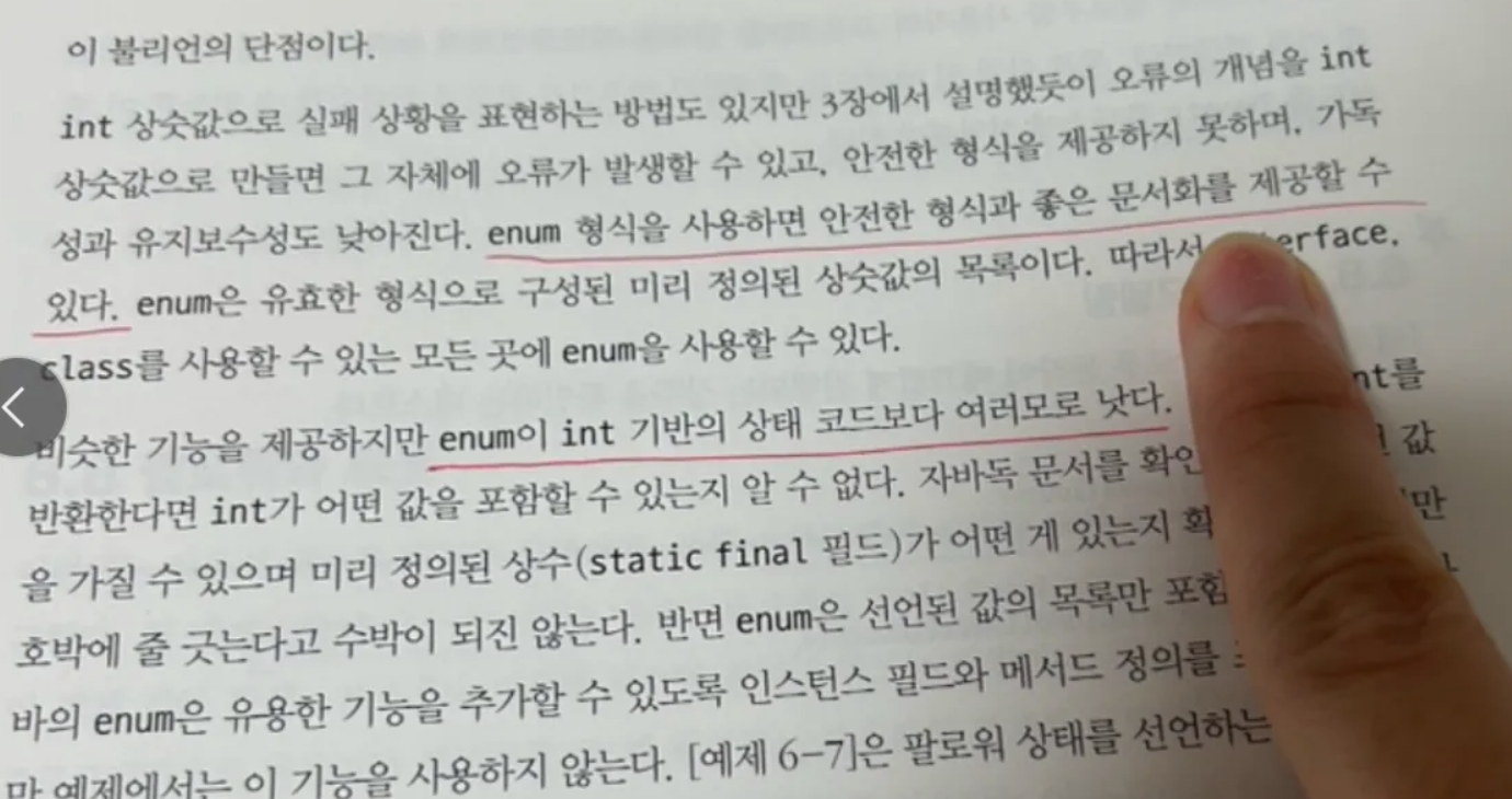 int 상수, boolean 대신에 Enum을 클라이언트에게 넘겨서 가독성 좋고, 분기하기 좋게 만들자.
