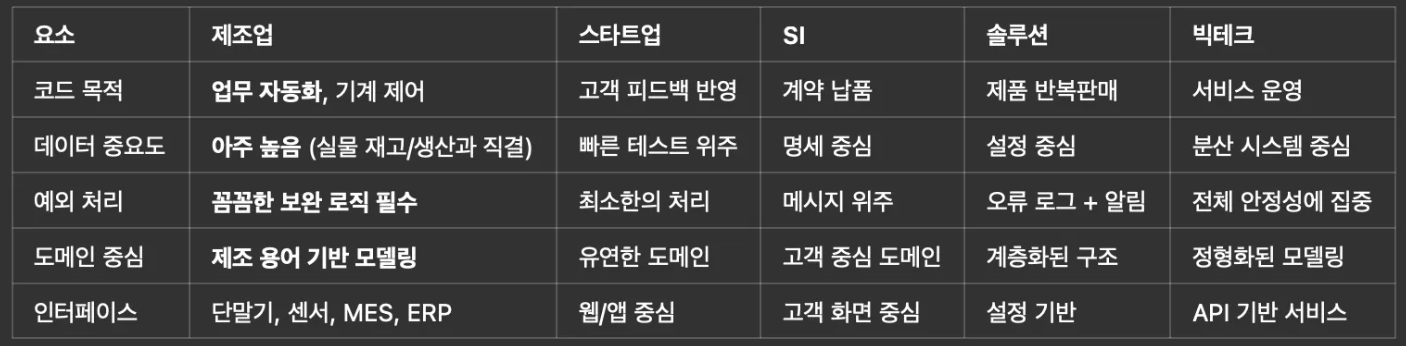 - 제조업 → 데이터 정합성과 안정적인 시스템 연동
