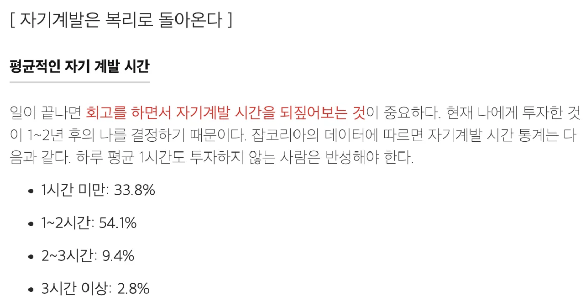 - 2.8%의 퇴근 후 3시간 이상 공부하는 사람이 되어야 2-3년 뒤 훗날을 도모할 수 있다는 압박도 있다.