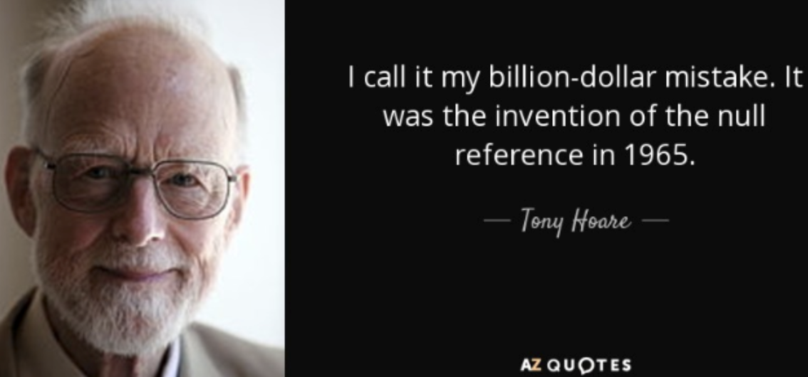 “컴파일러가 자동으로 모든 참조가 안전한지 확인하려고.. 값이 없는 상황을 null로 구현” 2009년 발표 중 "죄송...10억 달러짜리 실수.. null을 창조한건 뼈아픈 실수"